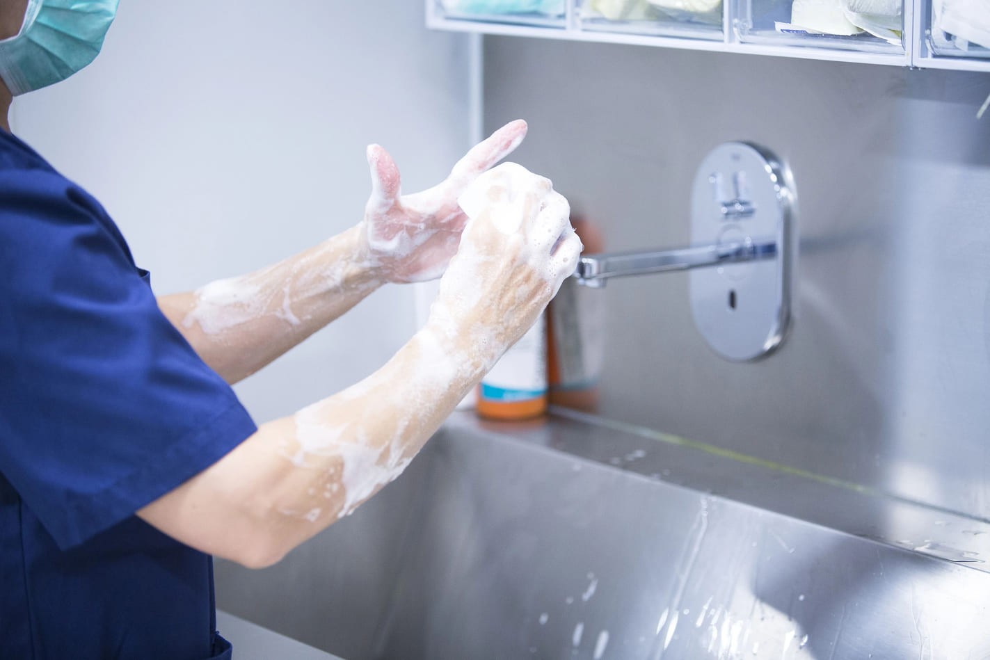 A pele do paciente e as mãos da equipe médica passam por antissepsia antes da incisão.